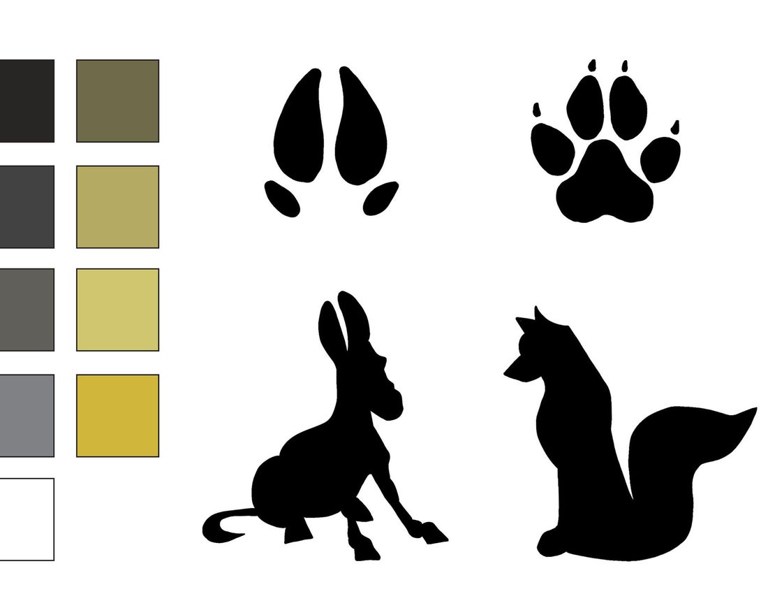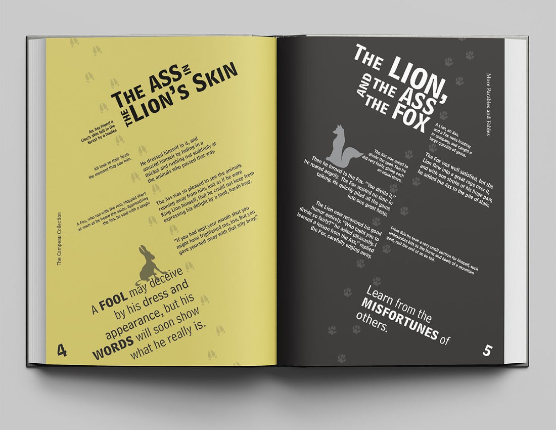 The fable is designed with a yellow and black design with off-kilter axes for the content to guide. The reason for the chosen fables was due to them having the same characters. The type clusters are created with a contrasting colour as well as creating a hierarchy with the font size and thicknesses.