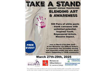 This week, on March 27, 28, and 29, the Marianne van Silfhout Gallery is hosting the "TAKE A STAND" project to help raise awareness about the human trafficking epidemic along the 401 corridor that is targeting the young people in our communities and the vulnerable students at our college.   This impactful project was started by the staff at the Maison Baldwin House women's shelter in Cornwall after receiving a substantial donation of white Calvin Klein jeans for their fundraising boutique. The Public Educator for the shelter, Danielle McCormick, developed a presentation about human trafficking that she took into the high schools in the Cornwall area to teach students about what they can do to protect themselves and their friends.