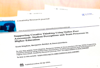 Scott Maybee, faculty member in Professional Services and Innovation, has published a research paper on team-based creative thinking in the Creativity Research Journal, a leading peer-reviewed global publication focused on the study of creativity.  The research, titled "Supporting Creative Thinking Using Online Peer Assessment: Student Perceptions and Team Processes in Higher Education," was conducted in collaboration with scholars from Queen's University and the University of Toronto Scarborough. Scott was the lead researcher on the project, which marks an important contribution to understanding how educators can support student creative processes as they share, build, and develop ideas in teams.