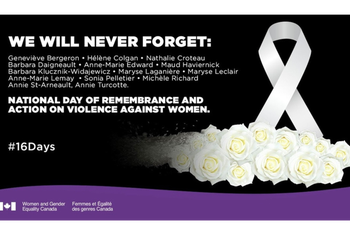 Every December 6, we observe the National Day of Remembrance and Action on Violence Against Women. The day was established by the Parliament of Canada to mark the anniversary of the 1989 murders of 14 women at l'École Polytechnique de Montréal, who were killed because of their sex.