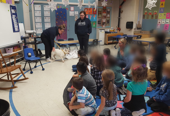 Veterinary Technology students, Bridget Cox and Mackenzie Davidson, and her dog, Tootsie, paid a visit to a kindergarten class at Centennial Public School in Kingston to demonstrate and discuss basic veterinary care.