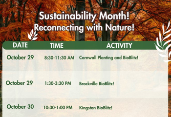 Reconnect with nature and learn about biodiversity on campus as we celebrate the final week of Sustainability Month! The SLC community is invited to get outside and work as a team tracking species through tri-campus bioblitz events. On Cornwall campus, get your hands dirty planting native trees and shrubs. For all events, please wear sturdy, comfortable footwear and dress for the weather – the events are rain or shine.