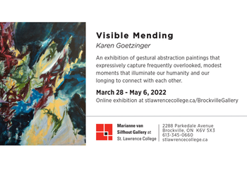 The Marianne van Silfhout Gallery at St. Lawrence College is pleased to present the works of Ottawa artist, Karen Goetzinger. The online exhibition is on view March 28 to May 6, 2022. The virtual show, entitled Visible Mending, includes eight large abstract and emotive paintings that “capture frequently overlooked, modest moments that illuminate our humanity and our longing to connect with each other,” according to the artist's statement.