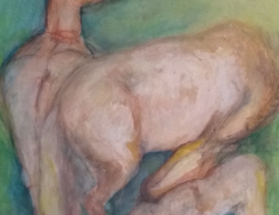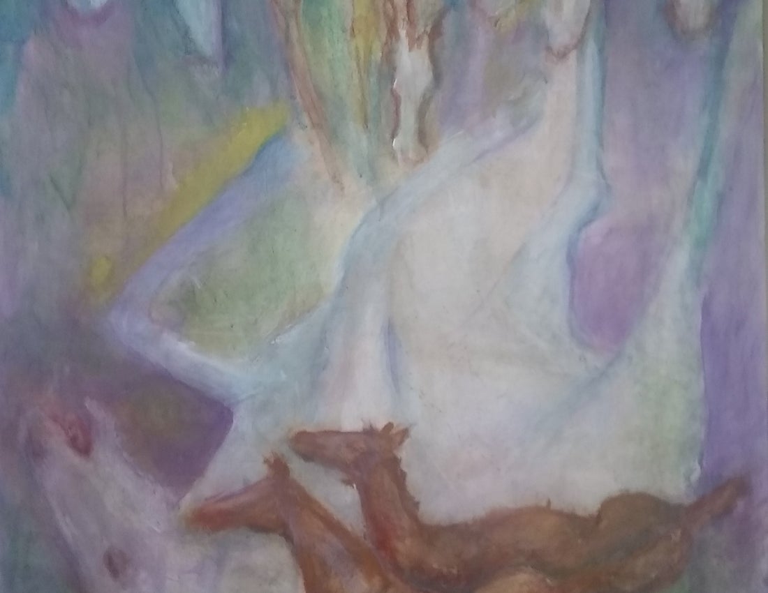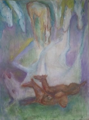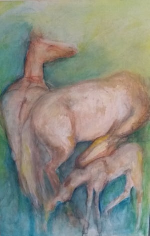Inspiration was difficult during lockdown. This piece started as a mustang rolling in the dust beside a gravel road, based on an old photo I had taken years ago in the Yukon. I returned to the painting this year, as the canvas demanded more “presence of beings”, and added eight lively, lovely, encouraging young wild things, transforming the scene into a baby party!