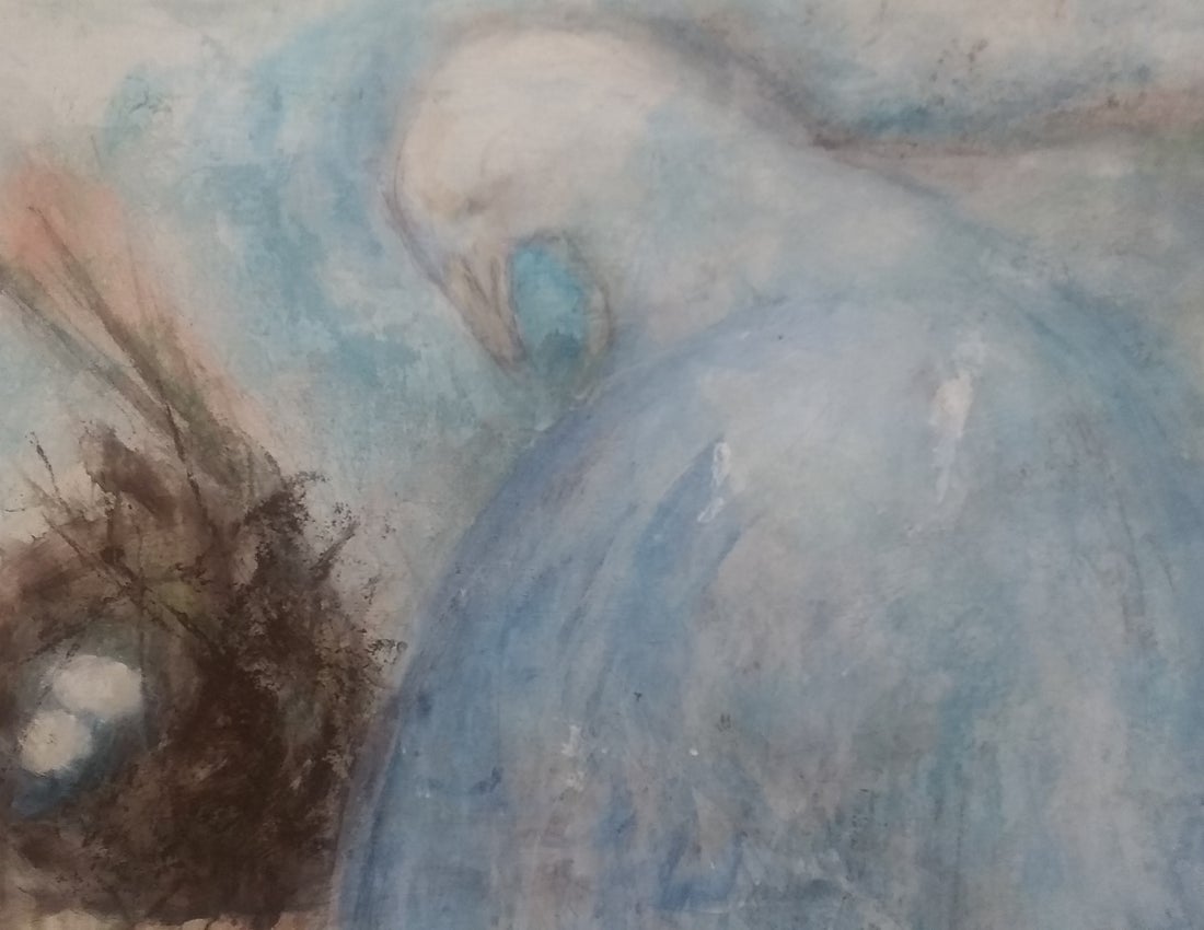 During the Covid Lockdown art supplies were deemed non-essential. Just as some birds are known to recycle nests, this piece was created on an upcycled canvas with discarded, hardening paint applied with hard-edged sticks, bits of grass, twigs, and hair. I am pleased by the results.