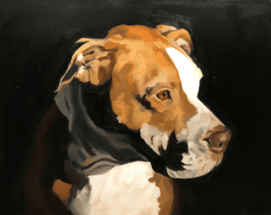 This is a portrait of my dog who passed away 2 years ago. She was a remarkable dog and I wanted to capture her beauty in this piece with the golden tones of her coat, her intelligence: the piercing look in her eye, and her importance: her being the only subject in this piece with chiaroscuro technique.