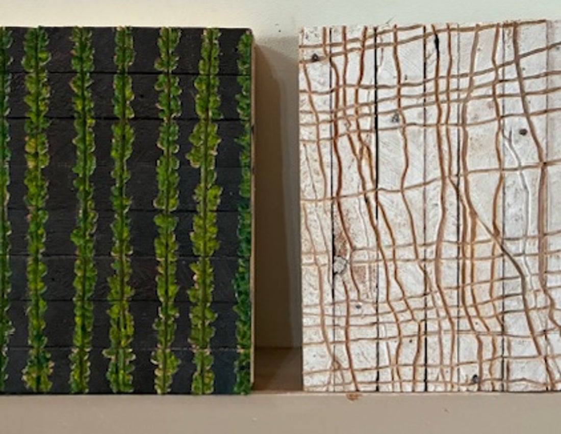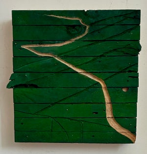 I am part of the growing movement in contemporary art that uses “trash’ as material for art making. I create sculptural bas reliefs out of salvage: lath, household cans and scrap metal. The lath is combined with canvas, or embedded in plaster, then painted and gouged. I see these works as three dimensional landscapes, recreating the surface textures of the countryside around Kingston.