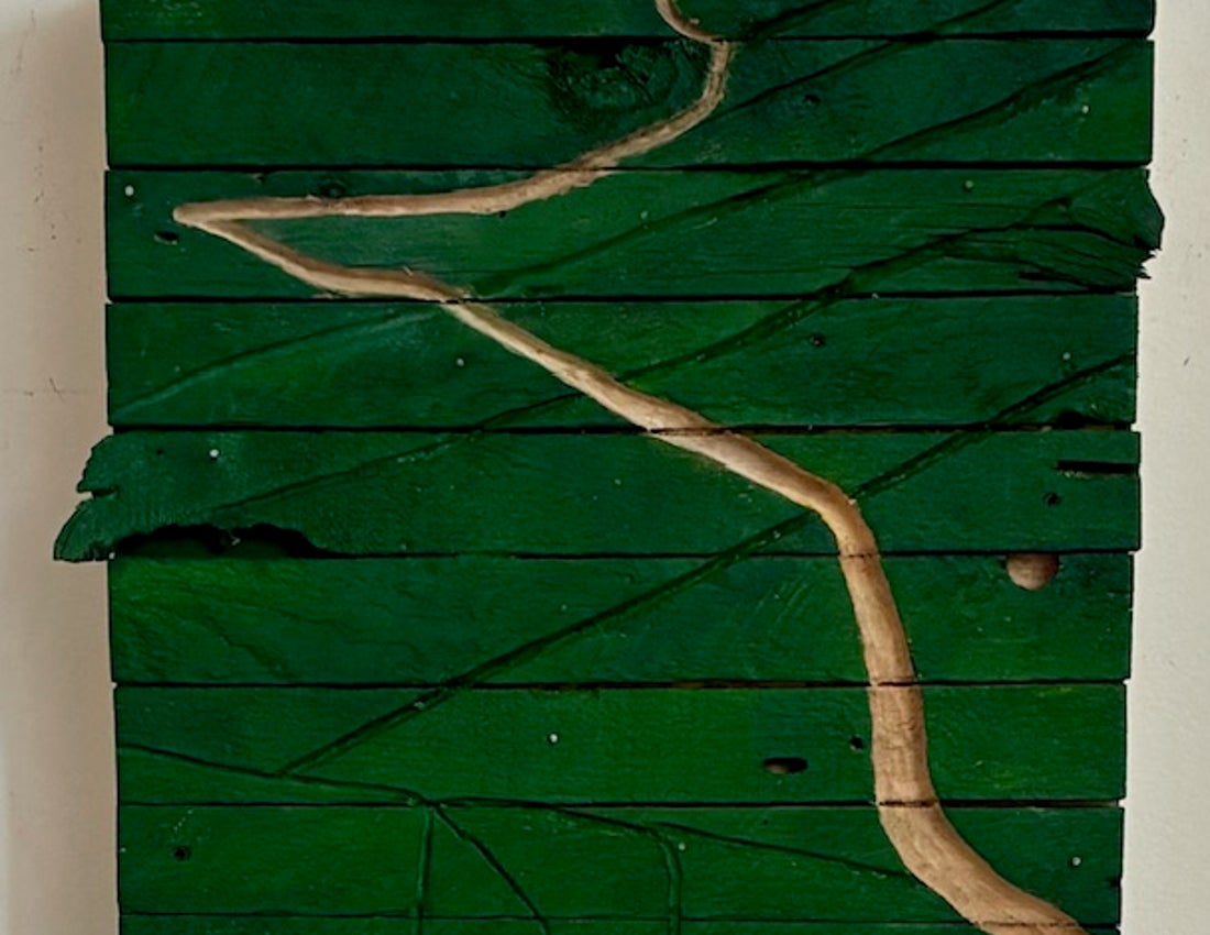 I spent my youth scrounging around Harold’s Demolition when it stood in Kingston’s inner harbour, and since graduating from OCAD in 2007, I have been creating sculptural bas-reliefs out of similarly salvaged materials. Lately, this has been mostly lath (strips of wood left exposed in older homes when lath and plaster is being replaced by drywall) which I combine with paint, plaster, and scrap metal.