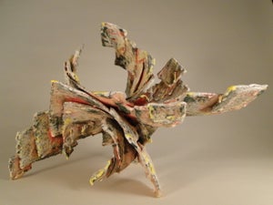 I layer thin rectangular slabs of clay guiding them into various directions, layering with wet clay slip and glazes. As the form dries enough to be stable, I roll it and continue to build until the structure becomes too fragile to add weight.