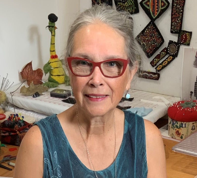 Pages are created through the use of commercial or hand-dyed fabrics, batiks, tulles, sheers, cheesecloth and netting. Dyes, inks and paints are included usually in the detailing along with hand or machine stitching, embroidery, needle and wet felting. The use of paper, metals, beads and found ephemera are often found in my art.