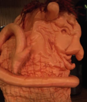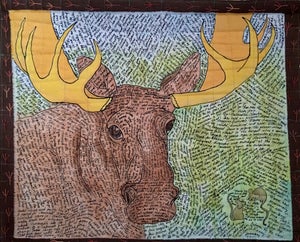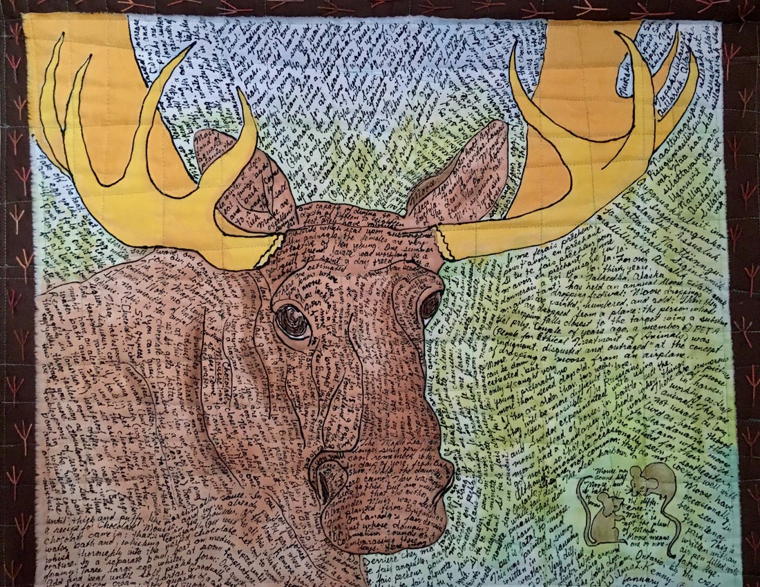I enjoy making fibre art with a variety of techniques: this show has examples of soft sculptures which incorporate stories, hand and machine stitching, and even a bit of wire-crochet. I’ll miss the little devil, who usually keeps my morning coffee hot! (Unlike the others, he’s completely washable.) The wall pieces have minimal actual stitching; they utilize airpen writing for story-telling and the texture is usually achieved through stitching.