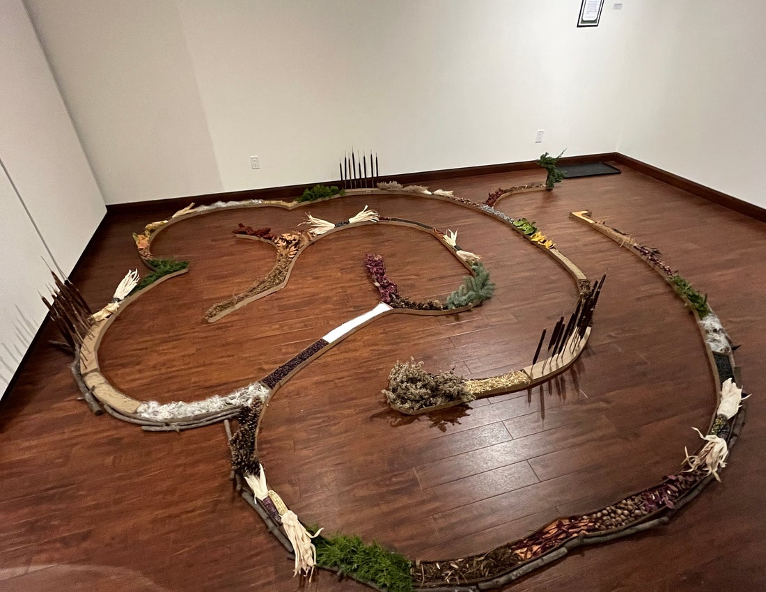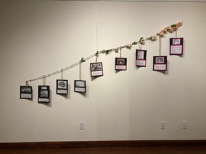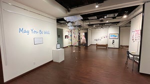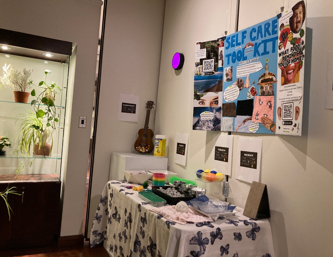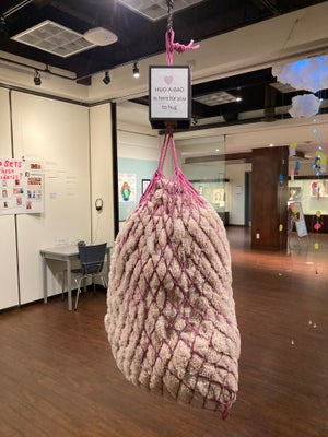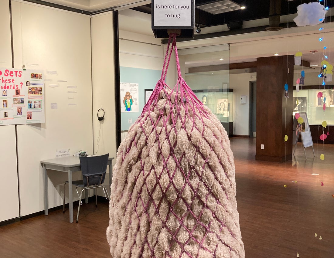 Through prompts and QR codes, you are invited to engage with the works in this exhibit by sharing a reflection, completing a survey, contributing to a word cloud, playing with toys, following a guided meditation, walking the labyrinth, or hugging the hug-a-bag.