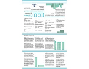 The design on this poster and brochure uses light colours that reinforce the “eco” theme. The colours include light blues, greens, tan, and brown, which are used throughout the poster not only to create hierarchy and improve readability but also within the illustrations.