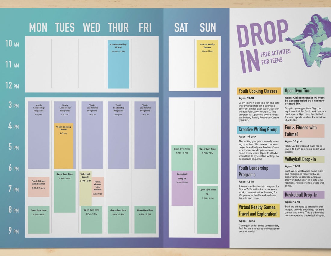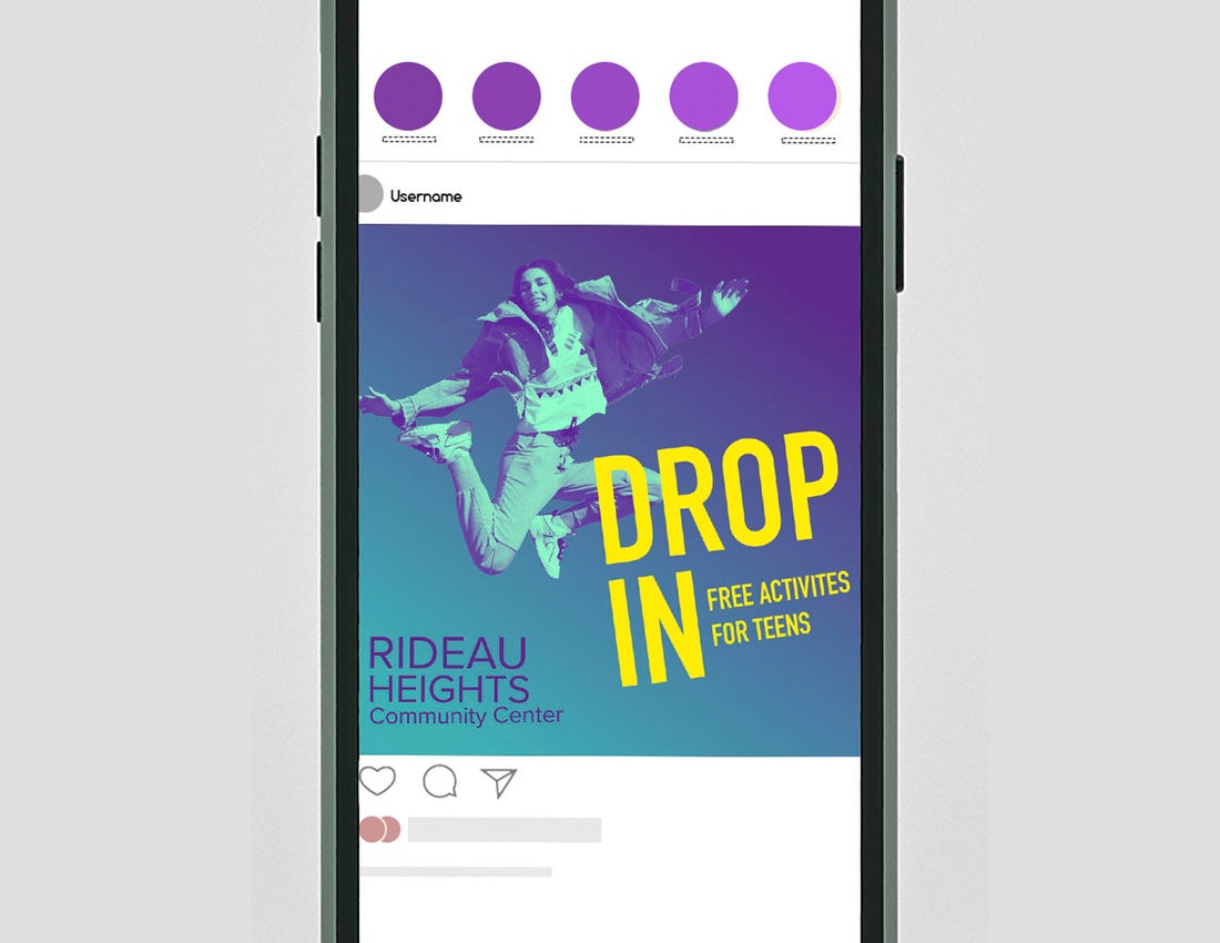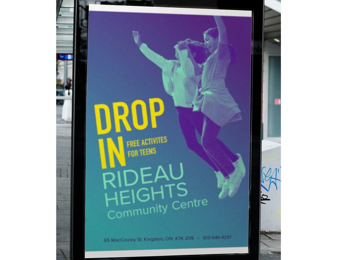 The marketing campaign was a result of extensive research process which focused on increasing participation in free programs and activities for children in the Kingston community. The Rideau Height Community Centre was built as part of a 20 year community Revitalization project for the city of Kingston. However participation rates for activities that targeted teens were low. This campaign will help raise awareness for the Community Centre and has been designed to target teenagers asking them to drop in and participate in free activities.
