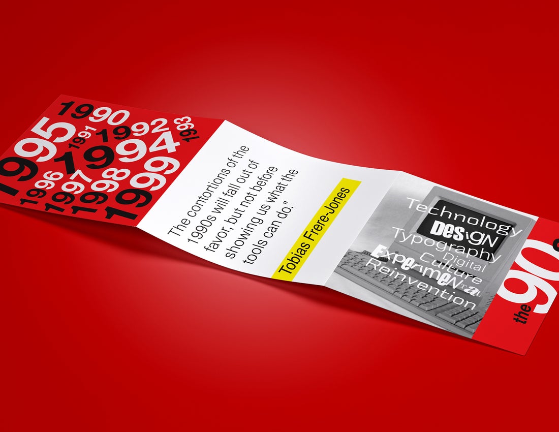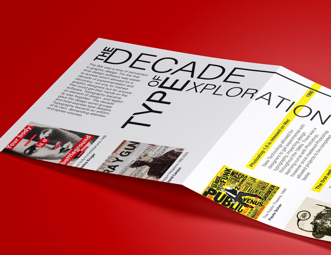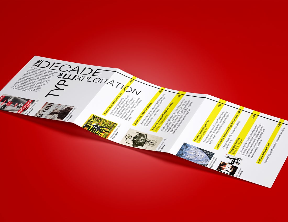 The timeline focuses on the advancement of technology in the early 1990s which resulted in the exploration of typography in graphic design. The timeline references famous designers, dates of when technology was released and publications that referenced typography.