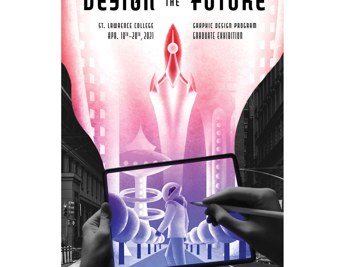 I wanted to depict an optimistic outlook on graphic design and the future, so that was where I started with planning this poster. I thought of things that were both visually futuristic and could be graphically dynamic. I realized that retro-futurism was the perfect match for my idea. This portrays to the audience that the program is forward-looking and gives a inspiring impression of the goals of the program. I took this idea and extended it to where a designer is depicted with their “ideas” flowing out of their tablet. To round out the look I used a thematic font that gives the feeling of glimpsing the future.
