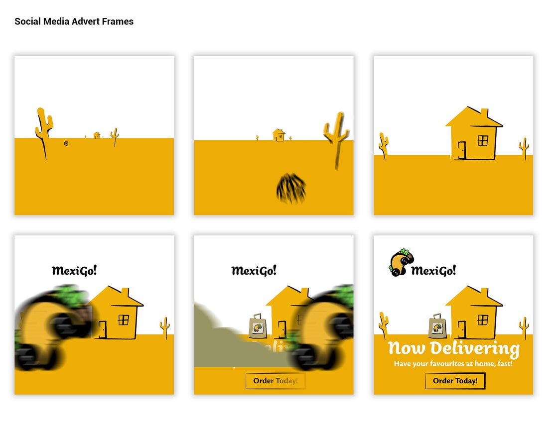 I took the illustrative style I developed for the logo and extended it into the menu design, using the energetic golden-yellow from the Taco-car to draw attention to key points. I also created an animated advertisement for delivery, as It is an important market to capture especially during the pandemic.