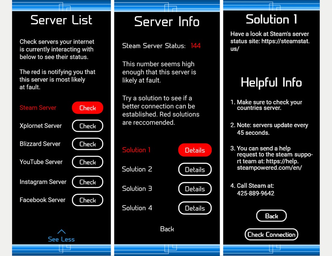 Using a internet network check, server listing checks and server info, users are able to identify all the current possible issues are that would be affecting there internet connection speed. The server provides several potential solutions, prioritizing most likely by the colour red, as well as a hierarchal order.